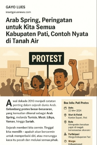 Catatan insetgalusnews: Tajuk ini bersifat edukatif, dimaksudkan untuk mengajak semua pihak belajar dari sejarah dan pengalaman daerah lain. Tidak untuk memprovokasi, menuding, atau menyamakan situasi Gayo Lues dengan Arab Spring maupun peristiwa di Kabupaten Pati.