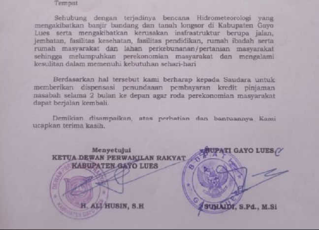 Permohonan penundaan pembayaran kredit diajukan sebagai respons atas bencana hidrometeorologi berupa banjir dan tanah longsor yang melanda Kabupaten Gayo Lues dalam beberapa waktu terakhir. Bencana tersebut menyebabkan kerusakan pada sejumlah infrastruktur vital, seperti jalan dan jembatan, fasilitas kesehatan dan pendidikan, rumah ibadah, serta lahan perkebunan dan pertanian milik warga.