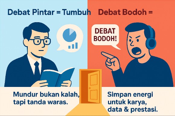 Karena itu, mundur dari debat semacam ini bukan tanda kalah. Justru tanda masih waras. Energi lebih baik dipakai untuk hal yang bermanfaat seperti berkarya, bikin data, atau menambah prestasi. Biarlah karya yang berbicara, karena bukti nyata jauh lebih keras suaranya daripada debat tanpa ujung.