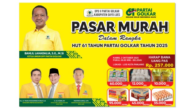 GAYO LUES | insetgalusnews.com | Dalam rangka memperingati Hari Ulang Tahun (HUT) ke-61 Partai Golkar tahun 2025, Dewan Pimpinan Daerah (DPD) II Partai Golkar Gayo Lues akan menggelar pasar murah bagi masyarakat.