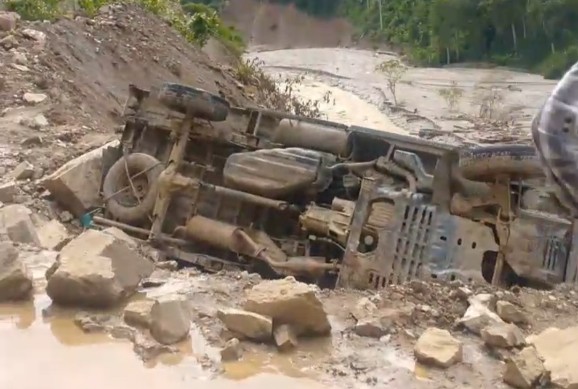 Jalur Darurat Tetumpun Rawan, Mobil Pick Up Terperosok Di Bibir Jurang