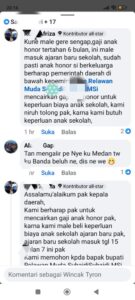 “Bagaimana bisa diam, gaji anak honor tertahan sudah enam bulan. Apalagi ini sudah memasuki tahun ajaran baru. Tentu saja para tenaga honor, terutama yang sudah berkeluarga, sangat berharap gaji mereka segera cair. Kami mohon, Pak, tolonglah-ini untuk biaya anak-anak kami masuk sekolah,” keluhnya dalam komentar di salah satu unggahan media sosial.