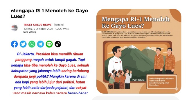 TAJUK RENCANA | insetgalusnews.com | Setiap kali nama Gayo Lues disebut di panggung nasional, ada getar yang berbeda. Kabupaten kecil di ujung Tanah Gayo ini bukan sekadar titik di peta Aceh, melainkan sebuah “mosaik” hutan tropis terakhir, kopi dengan cita rasa dunia, tari Saman yang mendunia, dan rakyat sederhana yang masih menanti jalan mulus serta fasilitas pendidikan setara kota.