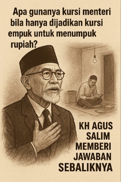 Di negeri yang kadang sibuk menimbun proyek dan tunjangan, Agus Salim justru sibuk menimbun kata, gagasan, dan doa. Ia tinggal di gang sempit, mendidik anak-anaknya di ruang tamu seadanya, sambil menolak godaan untuk menjadikan kursi menteri sebagai kursi empuk penuh rupiah.