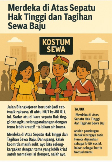 TAJUK | insetgalusnews | “Merdeka di Atas Sepatu Hak Tinggi dan Tagihan Sewa Baju” adalah pandangan redaksi bergaya satir. Humor digunakan sebagai kritik sosial demi meningkatkan kesadaran publik, bukan sebagai berita faktual murni. Setiap penyebutan biaya, tokoh, atau peristiwa bersifat umum dan tidak ditujukan menyerang pihak tertentu.