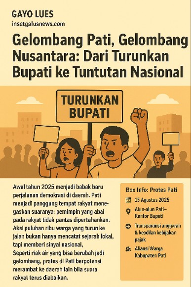 TAJUK RENCANA | insetgalusnews.com | Kabupaten Pati mendadak jadi trending, bukan karena festival kuliner, tapi karena ribuan warganya turun ke jalan. Euforia massa bak konser besar, hanya saja yang mereka nyanyikan bukan lagu cinta, melainkan nyanyian “turunkan bupati.”