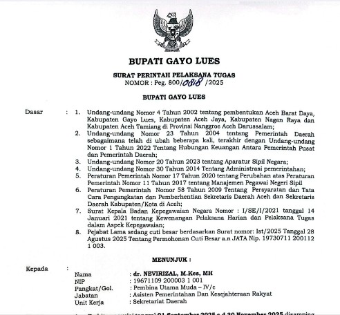 BLANGKEJEREN | insetgalusnews.com | Bupati Gayo Lues, Suhaidi, resmi menunjuk Nevirizal sebagai Pelaksana Tugas (Plt) Sekretaris Daerah Kabupaten Gayo Lues. Penunjukan itu tertuang dalam Surat Perintah Pelaksana Tugas Nomor: Peg.800/10818/2025 yang diterbitkan Senin (1/9/2025).