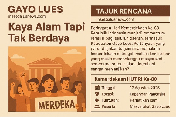 TAJUK RENCANA | insetgalusnews.com | Peringatan Hari Kemerdekaan ke-80 Republik Indonesia menjadi momentum refleksi bagi seluruh daerah, termasuk Kabupaten Gayo Lues.